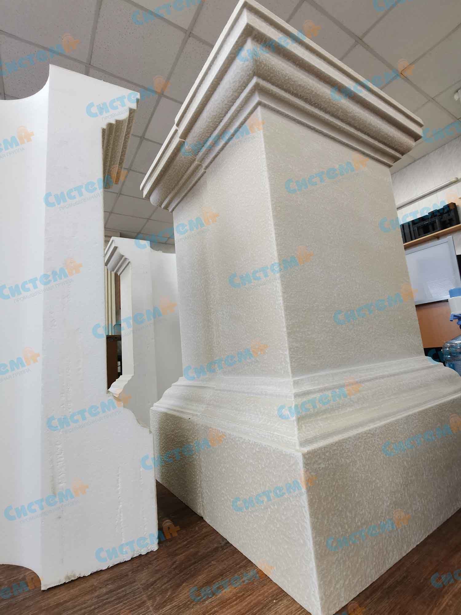 Этап выбора материала и защитного покрытия прошел быстро, так как ранее мы уже сотрудничали с клиентом, и он остался доволен качеством используемого сырья. Для изготовления капителей и оснований колонн выбрали пенополистирол как материал-основу и защитно-декоративное кварцевое покрытие.